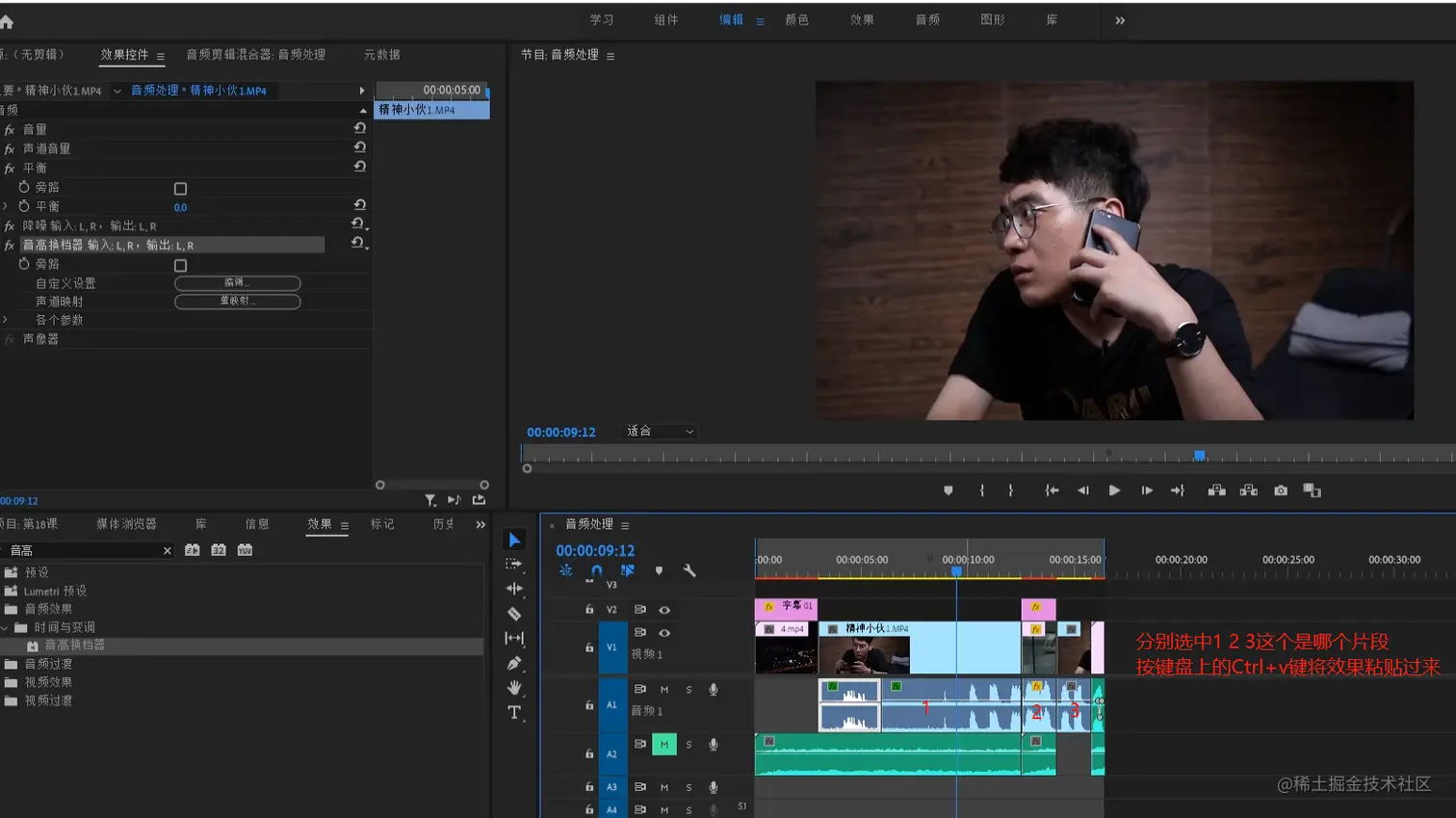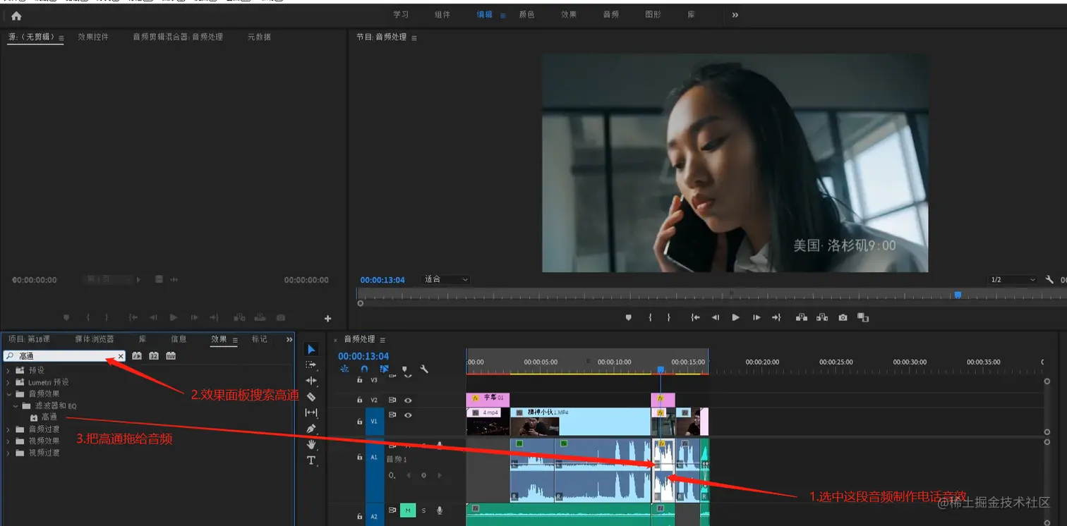 - 此时需要把电话的音效制作出来,选中此片段,在效果面板搜索