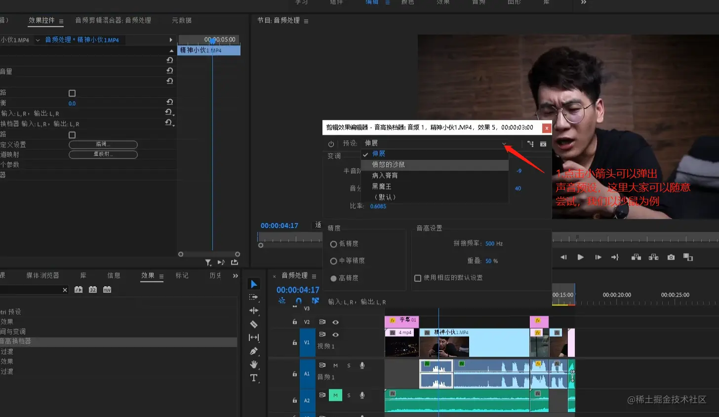 - 点击预设手边的小箭头可以看到预设效果,这里可随意选择,沙鼠效果...可以切换不同的尝试一下。