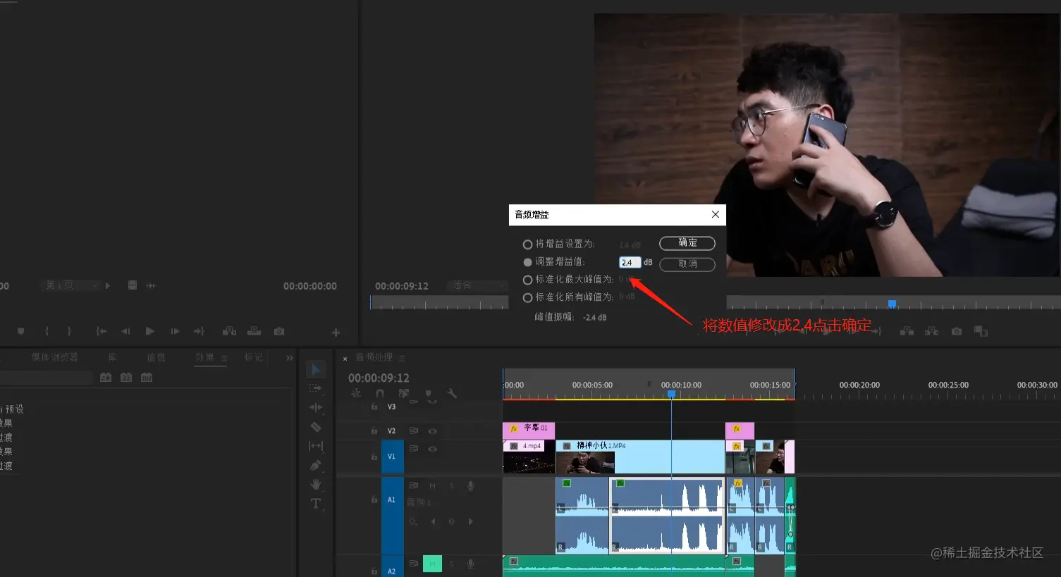 【调整音频增益值】设置成2.4