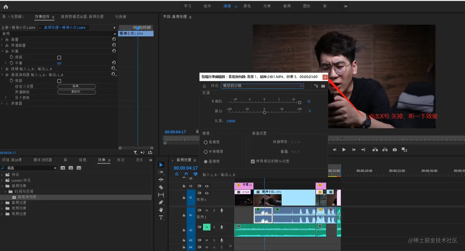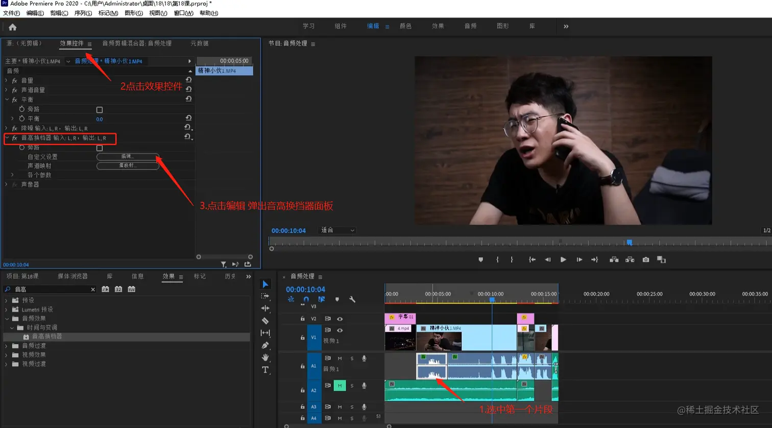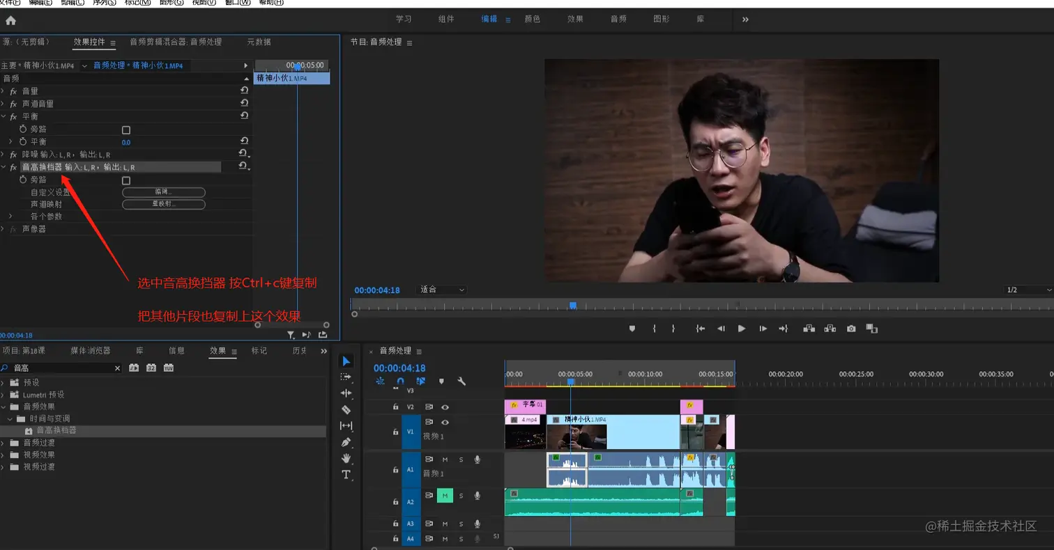 - 选中第一个音频片段,点击效果控件,点击音高换挡器的编辑按钮,会弹出音高换挡器的面板