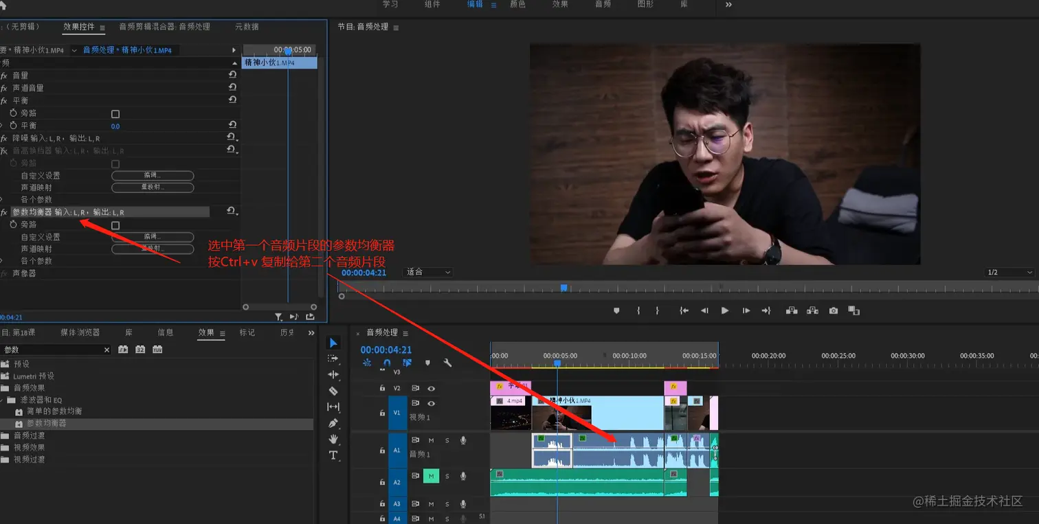- 将第一个音频片段的参数均衡器复制给后边几个音频片段。