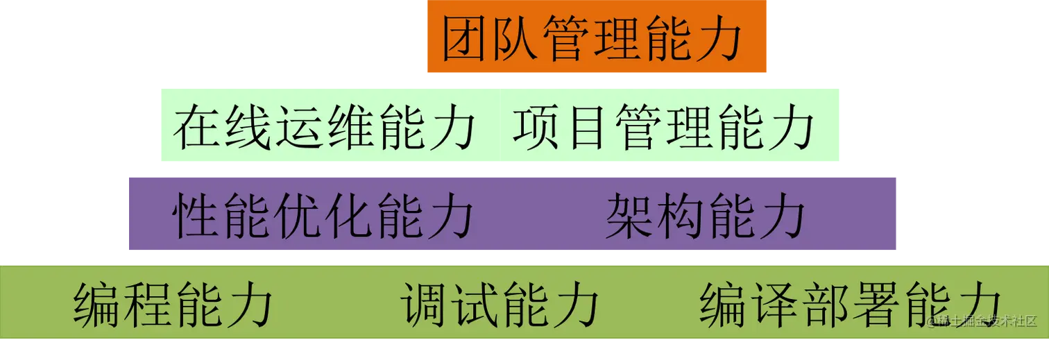 这几种能力之间的关系大概如下图。编程能力、调试能力和编译部署能力属于最基础的能力。不能精通掌握这三种能力,很难在性能优化能力和业务架构能力方面有所成就。具备了一定的性能优化能力和业务架构能力之后,才能在线运维能力和项目管理能力方面表现优越。团队管理能力是最高能力,它对项目管理能力的依赖度更大。