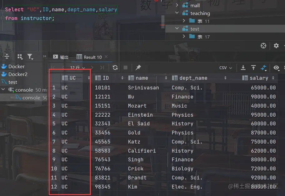 Select "UC",ID,name,dept_name,salary