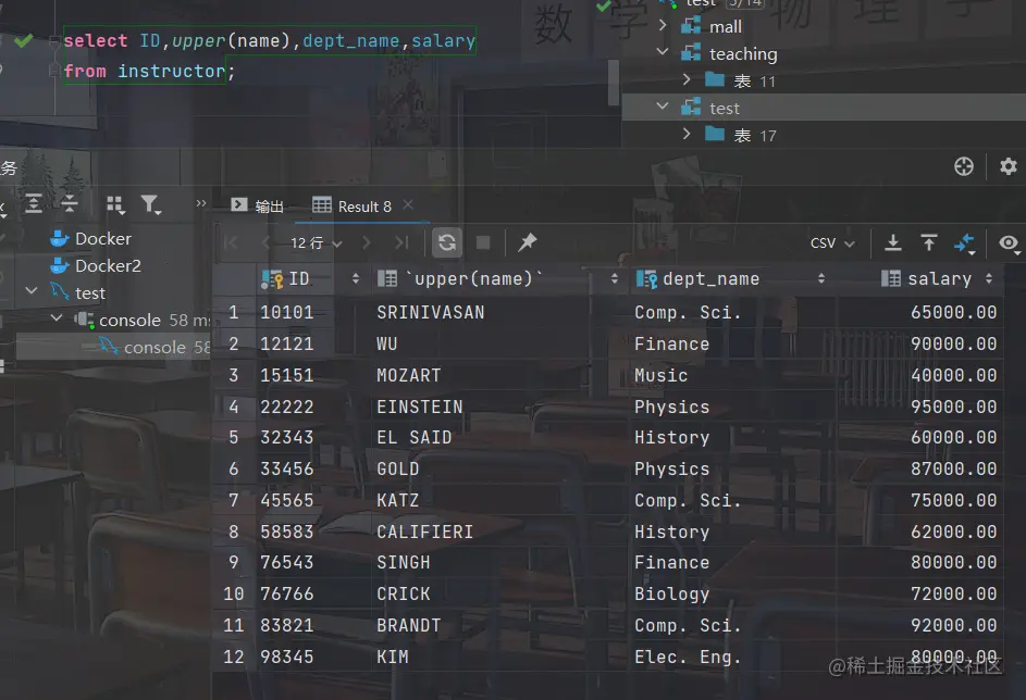 select ID,upper(name),dept_name,salary