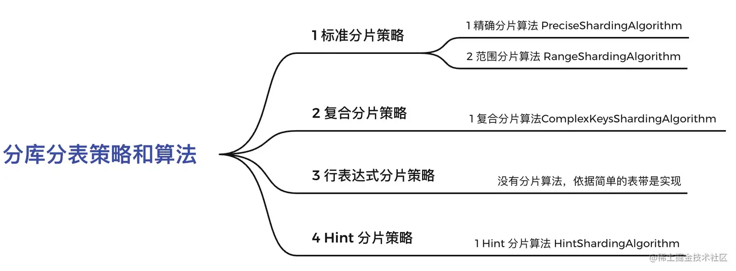 在本文中主要讲述了 sharding-jdbc 的一些场景,着重讲述了分库分表的算法和分库分表的策略,总结成一张图的话如下图所示: