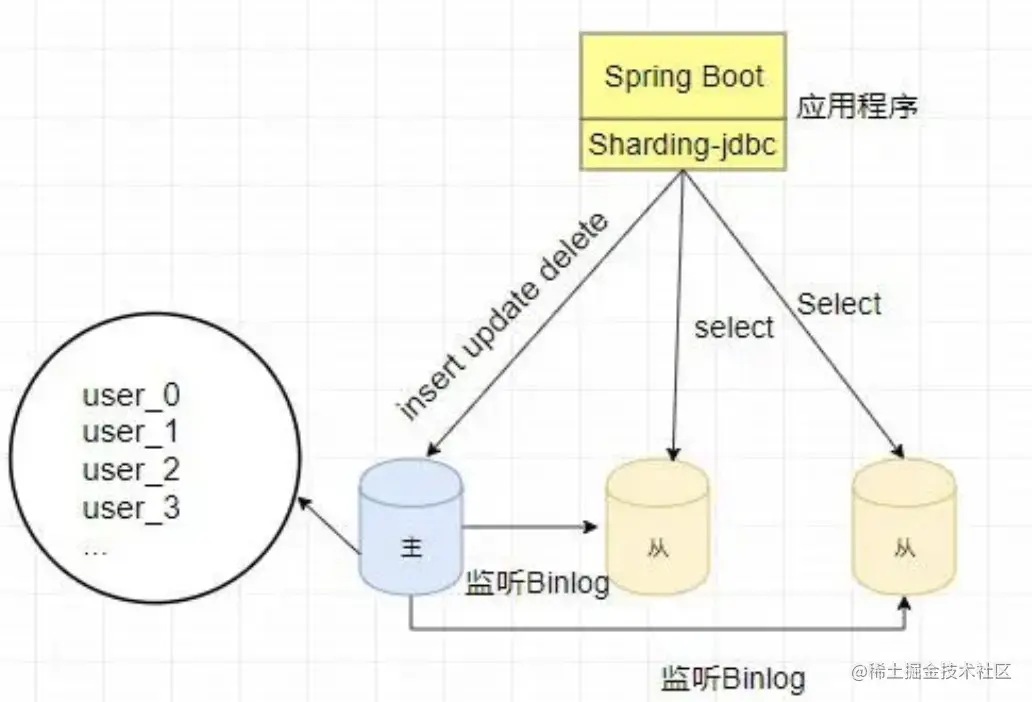 如下图所示,当数据库操作时,需要根据分库分表键操作数据库表,主数据库表完成之后需要将数据同步至从数据库,查询的语句需要在从数据库执行。