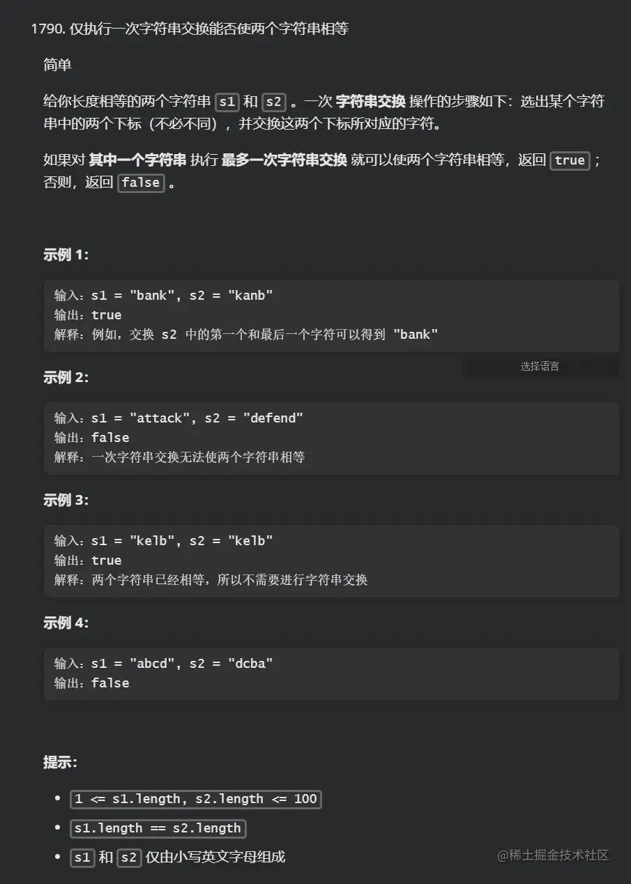 题目要求明确,给定的两个字符串 s1 和 s2,要求我们最多执行一次字符串总字符的交换,能够让 s1 和 s2 相等