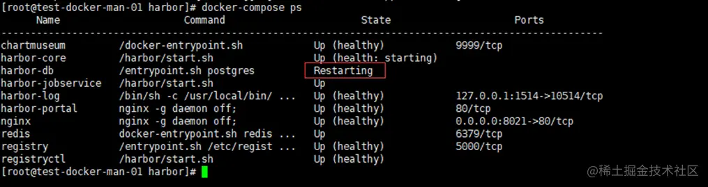 看到harbor-db组件处于Restart退出状态,从Harbor的架构可以分析出:Harbor-db组件的服务异常,造成登录界面输入的用户名和密码无法与harbor-db中的用户名和密码进行“校验”,所以会提示“用户名或密码错误”,而非用户名或者密码输入不对。