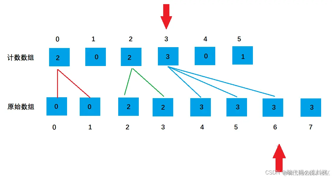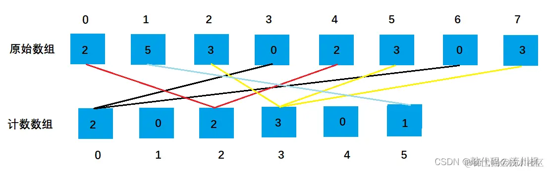 如果一个数组里所有元素都是整数,且在0—k以内,那对于这个数组的每个元素来说,如果能知道数组里有多少项小于或等于该元素,就能准确地给出该元素在排序后的数组的位置