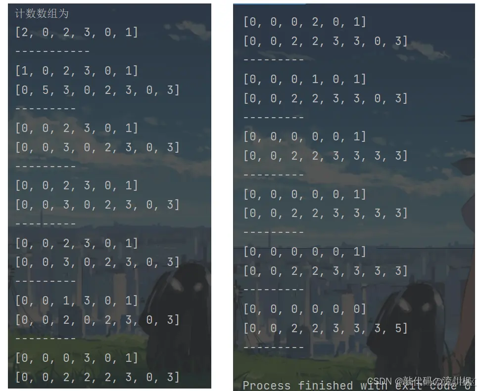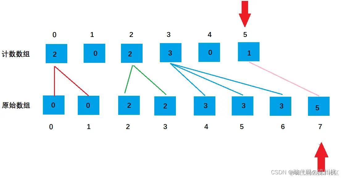 每次在原始数组放进一个元素时,计数数组的某个位置的元素值都会减一,直到计数数组的值全为0时,排序已经完成