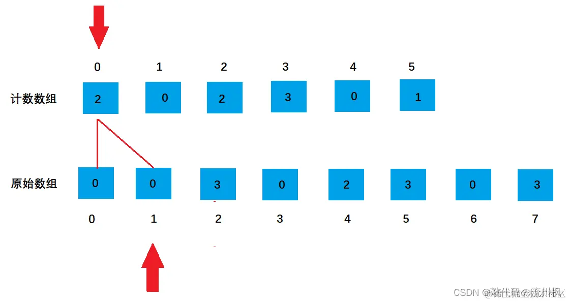 计数数组0位置的值是2,我们在原始数组的前两个位置放入0,放入一个值后,计数数组该位置的值就减1,原始数组索引向后移动准备存放下一个值