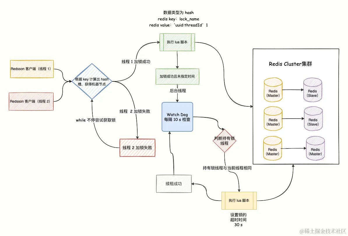 - watch dog 在当前节点还存活且任务未完成则每 10 s 给锁续期 30s。