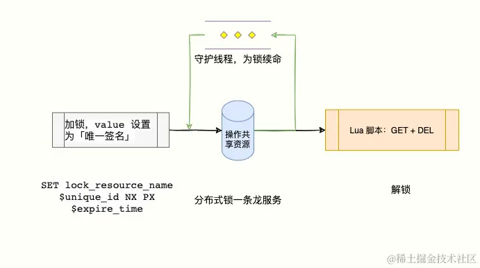 resource_name不存在的时候才能SET成功,从而保证只有一个客户端可以获得锁; - PX 30000:表示这个锁有一个 30 秒自动过期时间。
