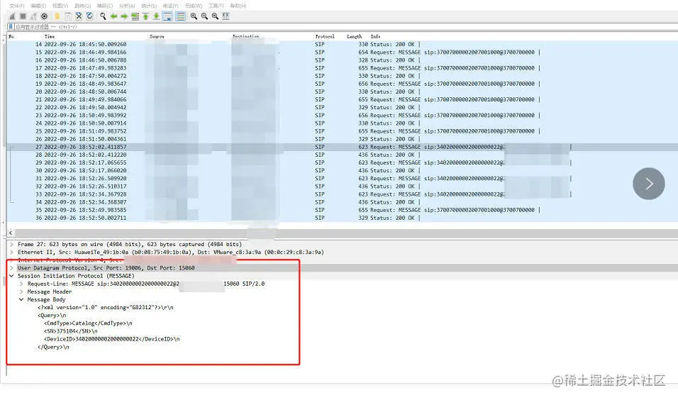 技术人员收到反馈后,立即对问题进行排查。平台级联使用的是国标GB/T28181协议,于是从抓包开始排查具体原因。