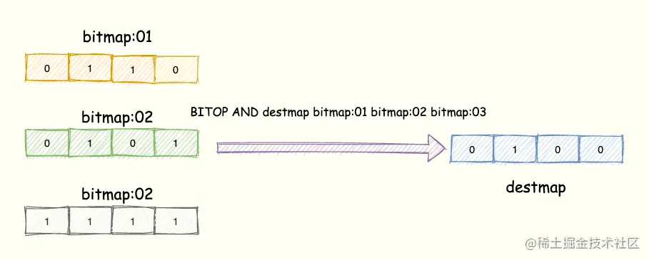 BITOP AND destmap bitmap:01 bitmap:02 bitmap:03