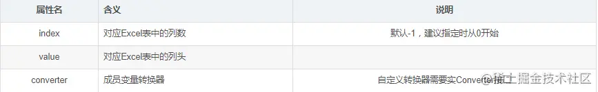 注:index属性可以指定当前字段对应excel中的哪一列,可以根据列名value去匹配,也可以不写。