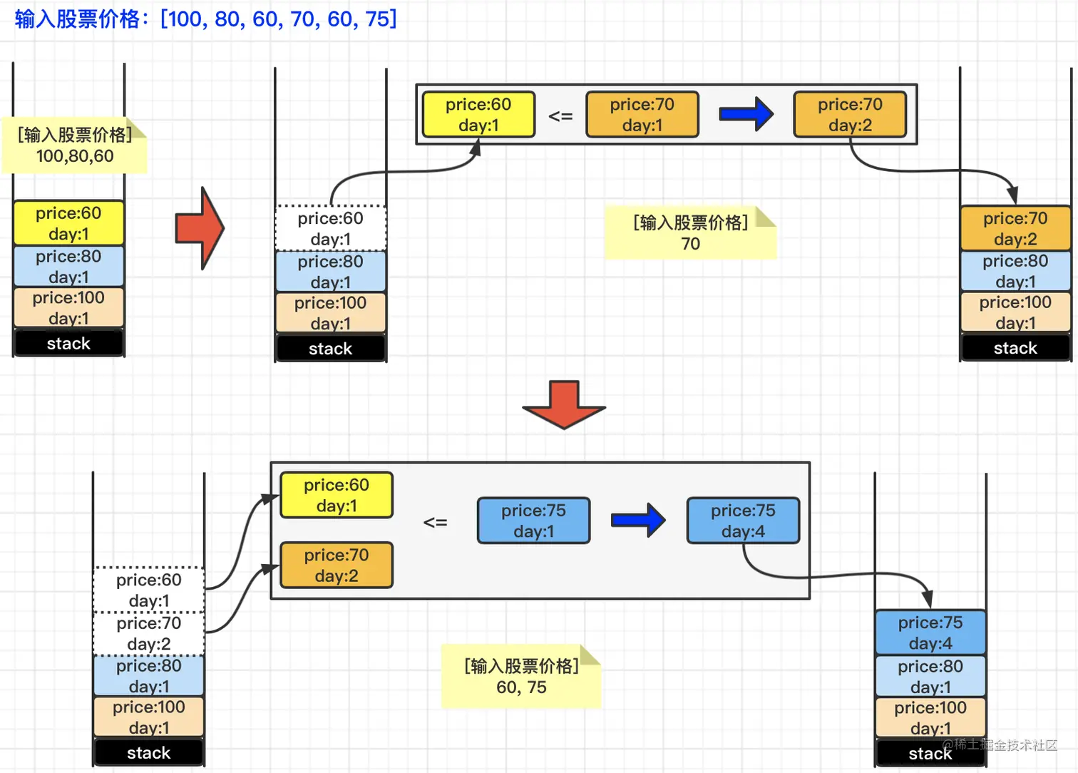 【情况3】如果“栈顶元素”的price小于等于“输入股票”的price,则将“栈顶元素”出栈,并将“栈顶元素”的day值加到“输入股票”的day值上。然后再对比下一个“栈顶元素”,操作以此类推,直到发现当前的“栈顶元素”大于了“输入股票”的price,则将“输入股票”入栈即可。