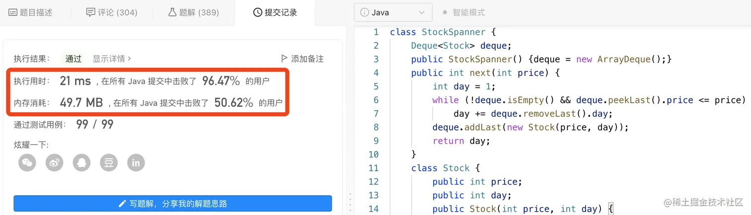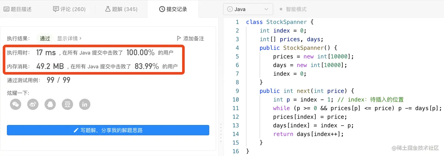 今天股票价格的跨度被定义为股票价格小于或等于今天价格的最大连续日数(从今天开始往回数,包括今天)。