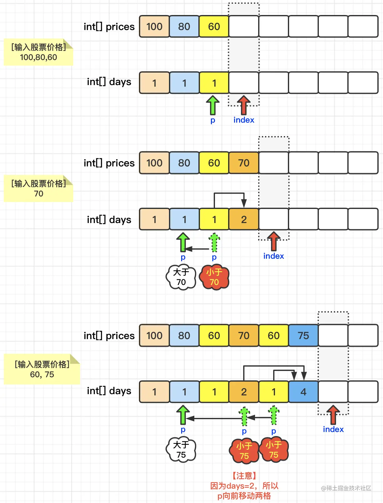 除了prices和days这两个数组之外,我们还需要两个指针,分别是index指针,用来指向“待输入股票”;p指针,index指针的前一个指针,用来与“待输入股票”进行price对比用的,如果它的price小于等于“待输入股票”的price,p就会向前移动。