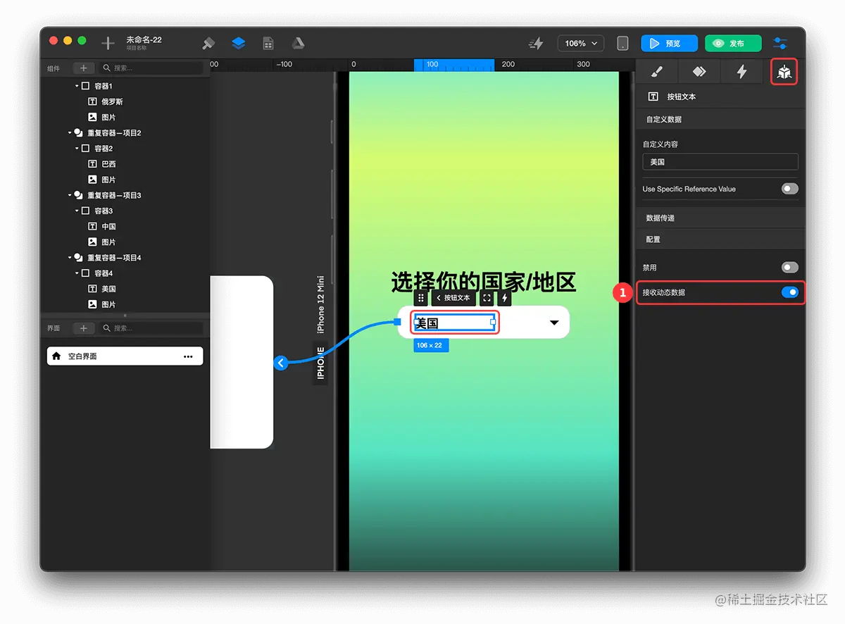 - 开启按钮文本的 接受动态数据