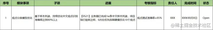 比如笔者曾经在负责系统模型准确率模块管理时,业务目标在是今年将100个观点分类准确率提高至70%,并上线至系统让用户可以正常试用。