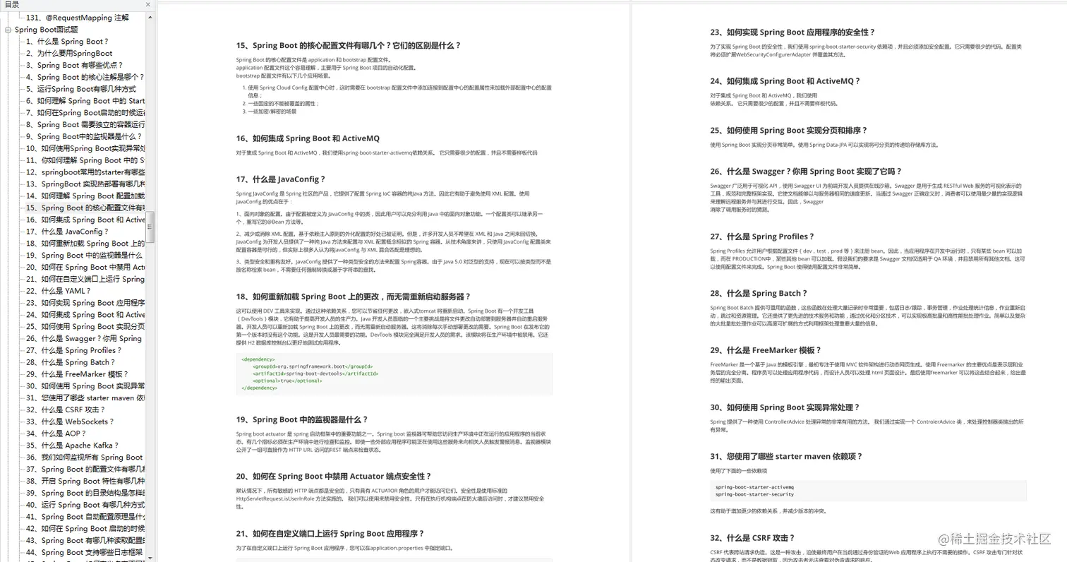 内容太多就不一一展示了,后面还有Spring Cloud面试题35道、RabbitMQ面试题32道、Dubbo 面试题40道、MyBatis 面试题28道、ZooKeeper 面试题49道、数据结构面试题8道、算法面试题21道、Kafka 面试题25道、Elasticsearch 面试题24道、、微服务面试题50道、Linux面试题48道。