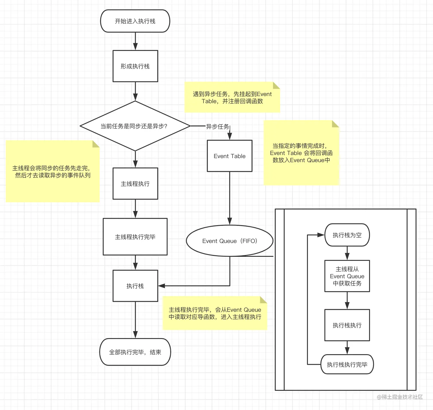 - 当调用栈中的所有同步任务全部执行完成,将任务队列中的任务按顺序一个一个的推入并执行,重复执行这一系列的行为。