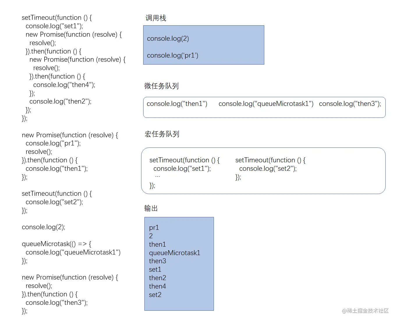 执行过程: 同步代码aaa-》p1-》宏任务之前把两个微任务处理掉-》res1 10-》989-》处理过程中继续产生微任务,继续处理-》res2 9-》990-》res 8-》991-》处理宏任务之前的微任务p2-》产生了一个宏任务setTimeout放到任务队列里-》执行宏任务,第一个setTimeout-》setTimeout1-》第二个setTimeout-》setTimeout2
