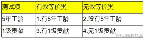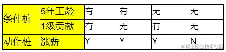 1、员工有5年工龄且1级贡献,涨薪。(覆盖1、3)