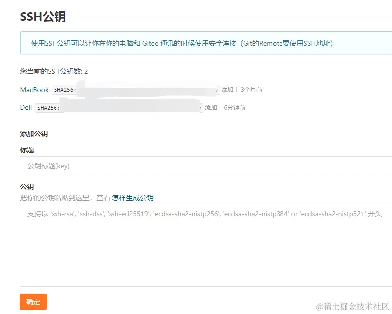 ssh-keygen生成 ssh 公钥和私钥,路径默认为~/.ssh,密码可不输直接回车。(如果电脑已经有 .ssh 目录可省略这一步)cd ~/.ssh进入 .ssh 目录id_rsa是私钥;id_rsa.pub是公钥,把公钥内容复制到远程 git 服务器中