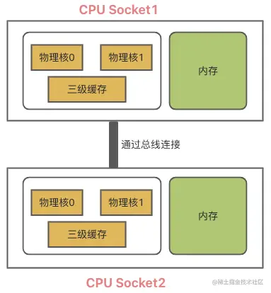 而且,主流的服务器上,通常会有多个CPU处理器(CPU Socket),不同处理器间通过总线连接。
