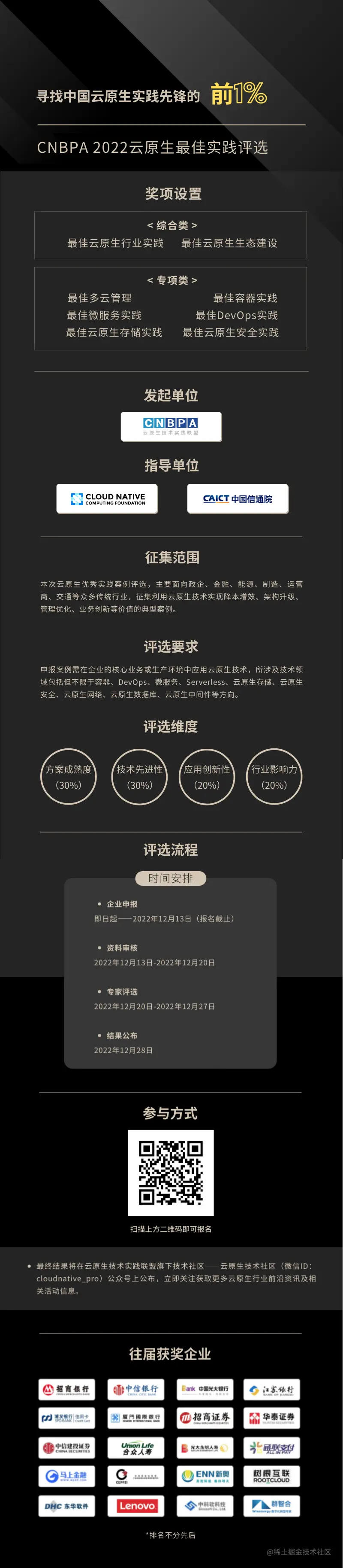 如果您所在企业是云原生实践的先行者、排头兵,欢迎参与本次评选,让榜样的力量带动更多中国企业拥抱云原生,享受新技术带来的红利。