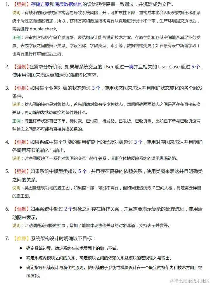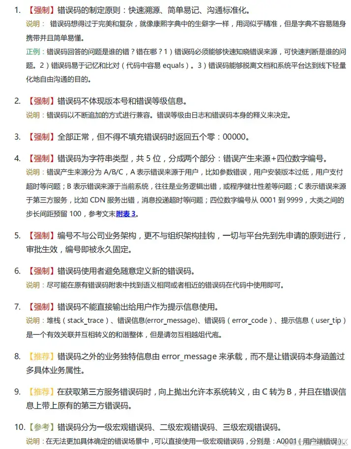 另外,依据约束力强弱及故障敏感性,规约依次分为强制、推荐、参考三大类。在延伸信息 中,“说明” 对规约做了适当的扩展和解释;“正例” 提倡什么样的编码和实现方式;“反例” 说明需要提防的雷区,以及真实的错误案例。