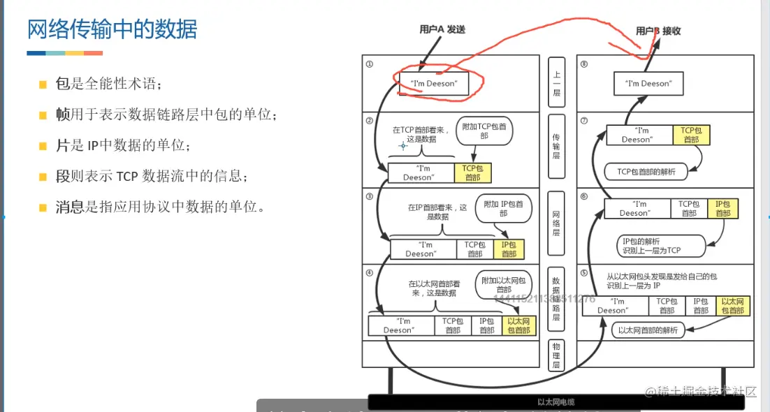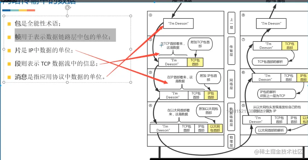 所以呢,一般来讲呢,对于每一层呢,它会有一个专门的一个相关的术语,一般来讲,我们说数据包这是个的全能型术语,是什么意思呢,意思不管你在传输层、网络层、数据层,都可以称之为数据包,那么真,我们常说的数据帧,这个帧一般来讲指的是说我在数据链路层的包单位,这里指的是真,那么骗,指的是做IP层的,我们称之为,叫做片,那么段指的是什么,TCP层的这个东西,TCP层打包以后呢,我们称之为段,那么消息一般讲是指我们的应用层要进行发送的应用数据呢,我们一般呢,把它称之为一个相关的消息,当然讲就我们平时作为这个程序开发来讲的话呢,不会分得这么,细致一般呢,我们会统称呢,就是叫做数据包对不对,到了,但是呢,到需要进行每层区分的时候,