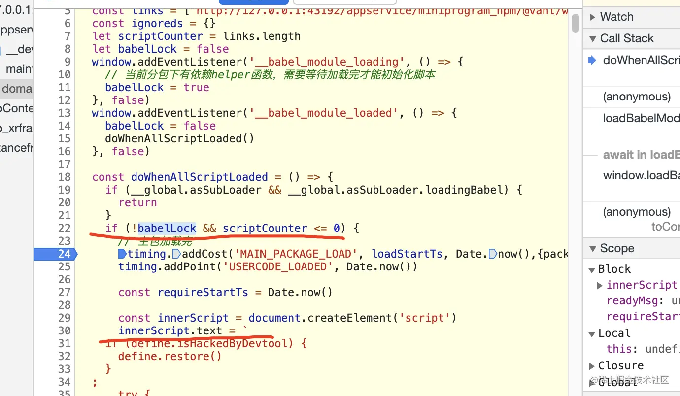 看图片,小程序启动中,在所有的babel和相关资源加载完毕,会创建一个script,script的内容就是加载主内容,第二张图。(个人理解,如有差错,评论请指出,谢谢)
