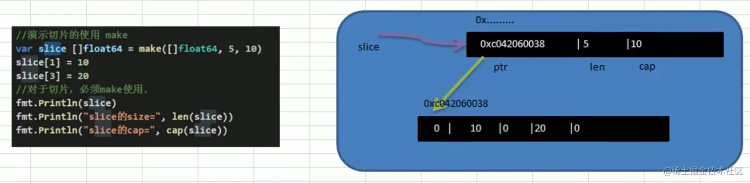 make来创建切片,make也会创建一个数组,是由切片在底层进行维护,程序员是看不见的。make方式创建切片的示意图: