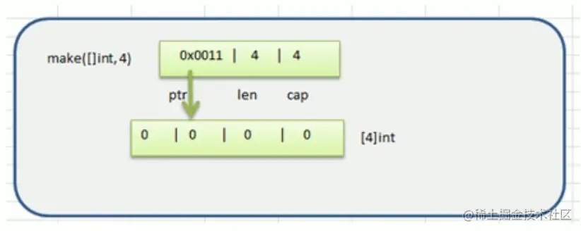 make方式创建的切片对应的数组是由make底层维护,对外不可见,即只能通过slice方式去访问各个元素。