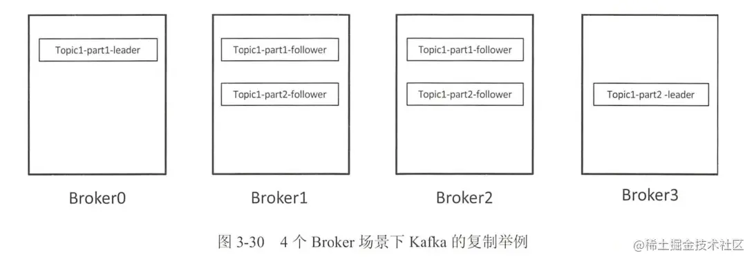 举例说明,假如Topic1复制因子设置为3,分区数为2。当生产者发送消息时,先计算属于哪个Partition,如果属于part1,则会发送至Broker0,写入Topic1-part1-leader,Broker1和Broker2下面的Topic1-part1-follower会去拉取消息并复制到本地,一旦副本数够了,leader就会提交。