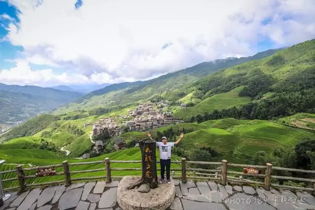 水稻是我国最古老的生态系统,现在建成了景区,梯田建了许多这种有栏杆的水泥路每隔一段距离,都会设观景台,还有一些水稻相关的知识,供游客学习。天气非常好,看可以看到还有一些村庄,在梯田中间,非常的有中国村乡风情。从这个角度看过去,龙脊梯田如链似带,它将一座座的山峰环绕成一只只巨大的龙,因为像龙背一样,所以才得名友脊梯田。