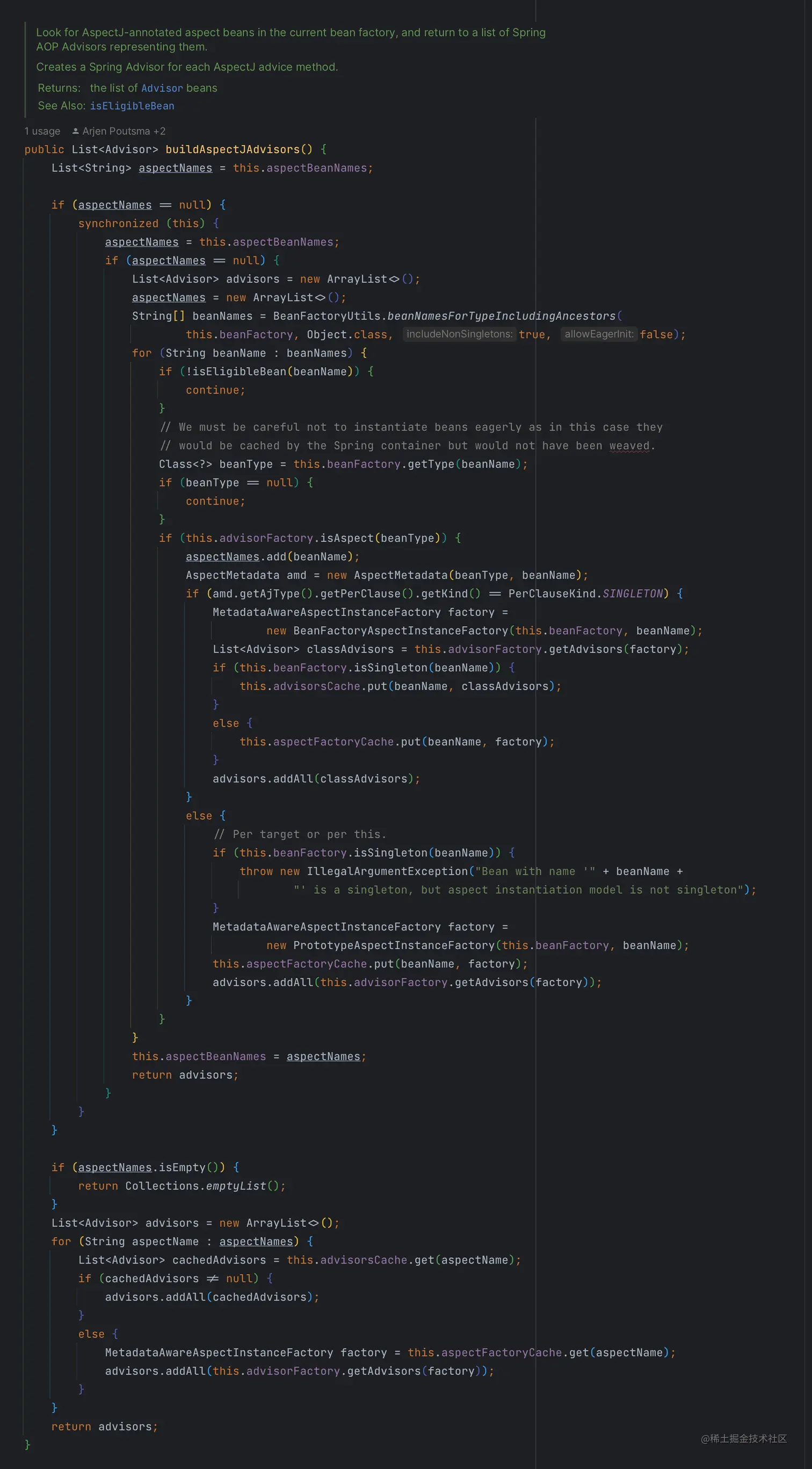 从方法的注释中可以看到,这个方法的作用就是在容器中找到所有基于 Aspect 注解配置的切面信息,并为每一个增强方法创建一个 Advisor,以列表的形式返回结果。