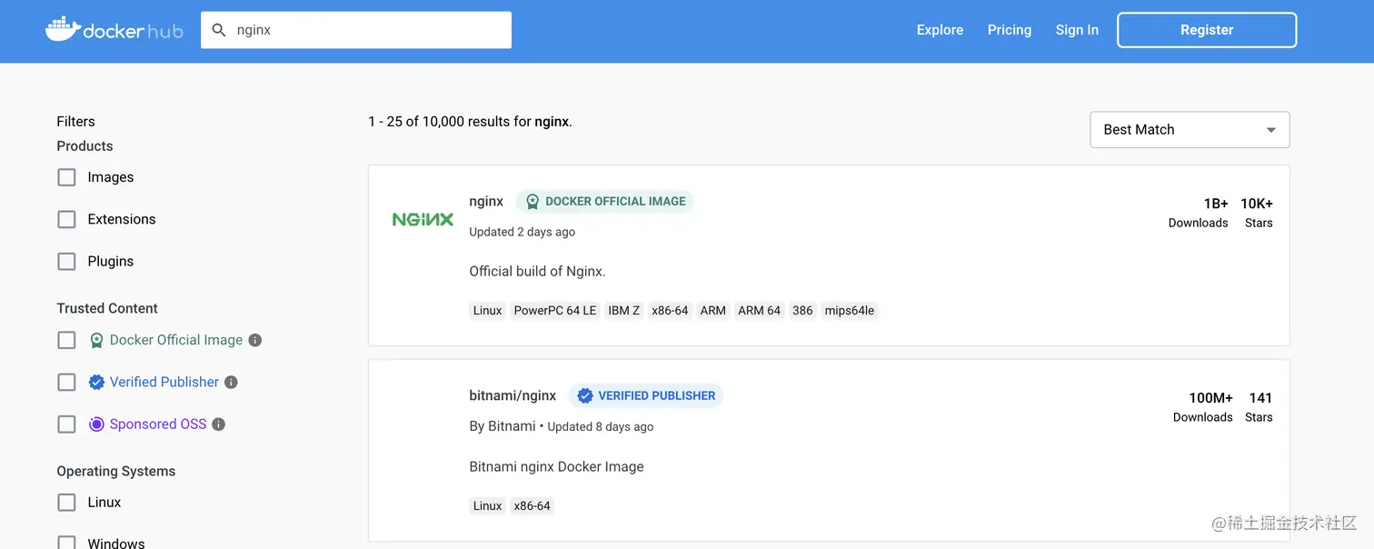 nginx,会搜索出很多结果,带Docker Official Image标签的是官方提供的镜像,选择这个官方镜像查看详情。详情中可以看到它的基本使用方法供大家使用时参考。