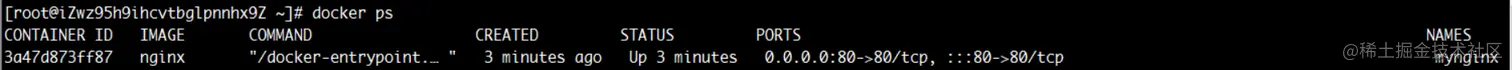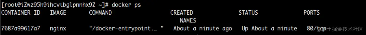 可以看到这次没有直接输出nginx的日志了,然是输出了一串编码,这个编码就是容器的完整编码。再次通过命令docker ps查看启动的容器