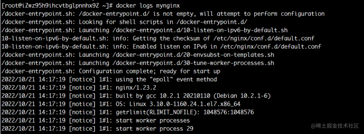 可以看到容器是成功启动的,然后可以通过命令docker logs mynginx查看容器的日志,可以看到跟之前直接启动nginx容器一样的日志,如下