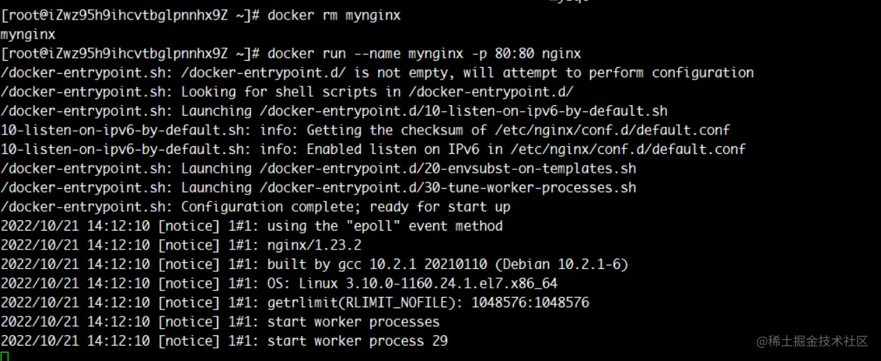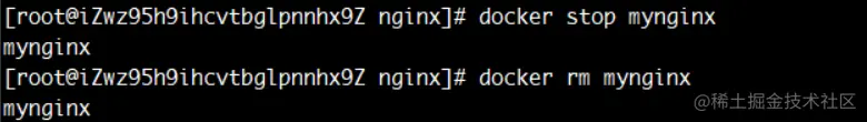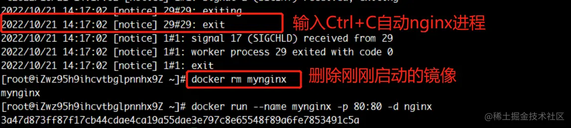 在第一个终端中输入Ctrl+C关闭nginx进程,然后使用命令docker rm mynginx删除之前的容器,输入命令docker run --name mynginx -p 80:80 nginx再次启动新容器。