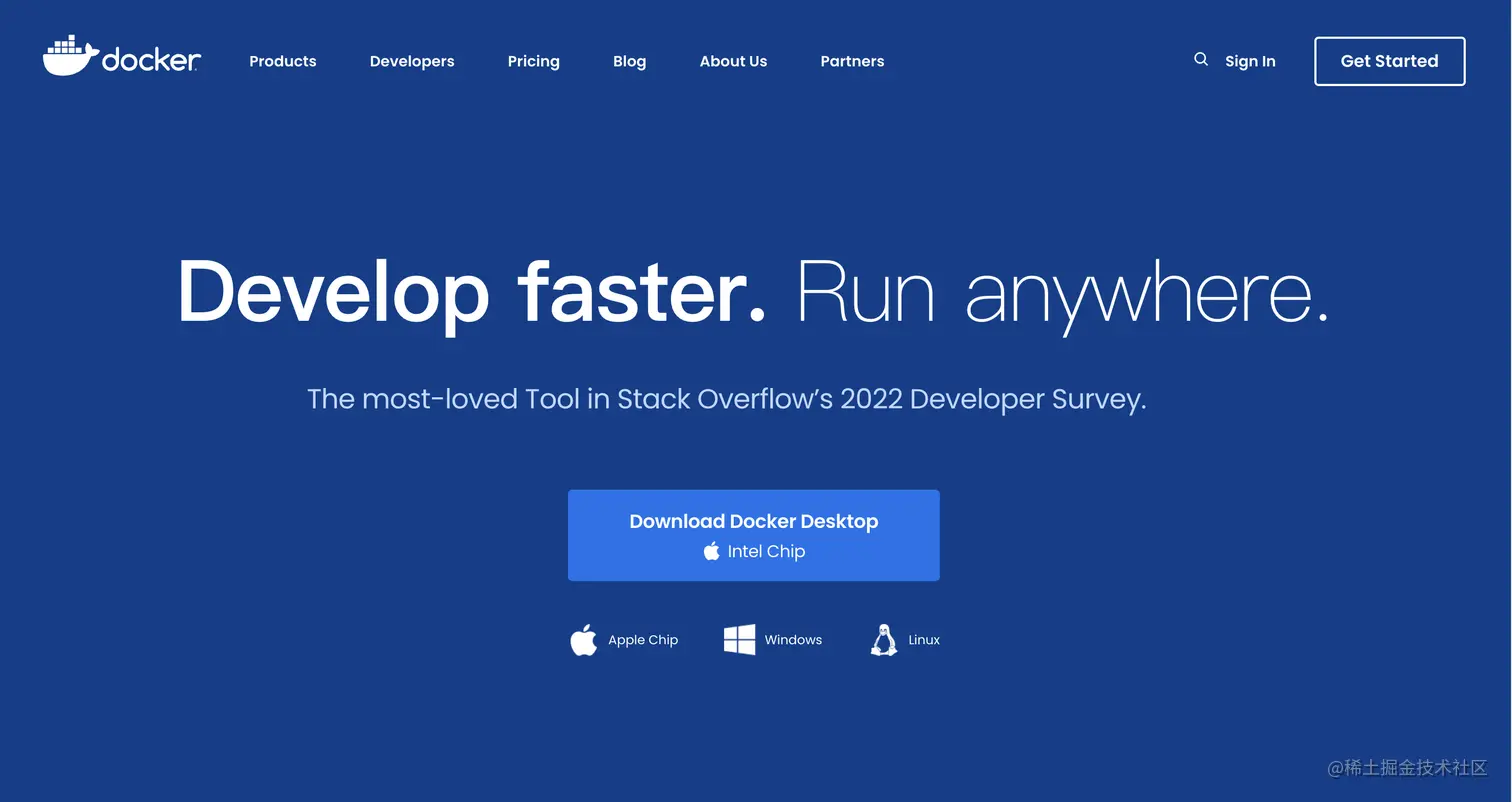 Docker Desktop提供了一个可视化操作界面,使得Docker运行起来非常简单,并且目前支持跨平台安装了。访问Docker 官网,根据自己的操作系统进行下载(Mac M1及以上系统,要安装Apple Chip版本,其他的安装Inter Chip版本)。