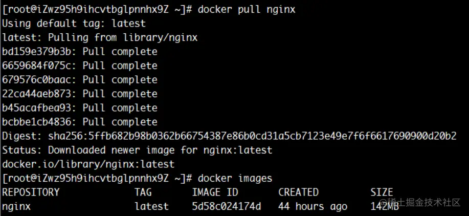 docker pull nginx拉取最新的nginx镜像,下载完成后,可以使用命令docker images查看服务上所有的镜像,检查是否安装成功。
