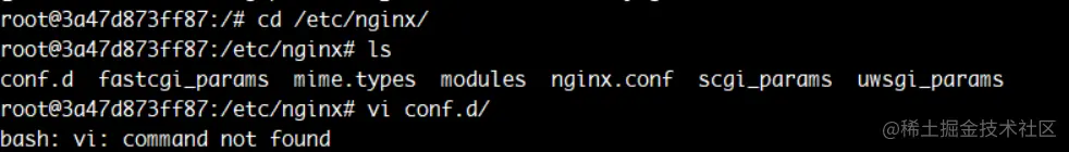 成功进入容器的终端之后,可以查看nginx的配置文件,通常是在/etc/nginx目录下