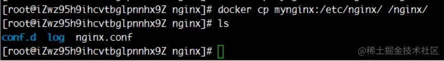 但是容器终端基本都是简化的,很多命令都是没有的,所以需要使用命令docker cp CONTAINER:SRC_PATH DEST_PATH容器内的配置拷贝到服务上。然后在容器终端通过命令exit退出。