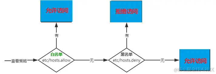 访问的过程:先检查/etc/hosts.allow文件,有则访问,无则继续访问/etc/hosts.deny文件,若有则拒绝,无则允许访问