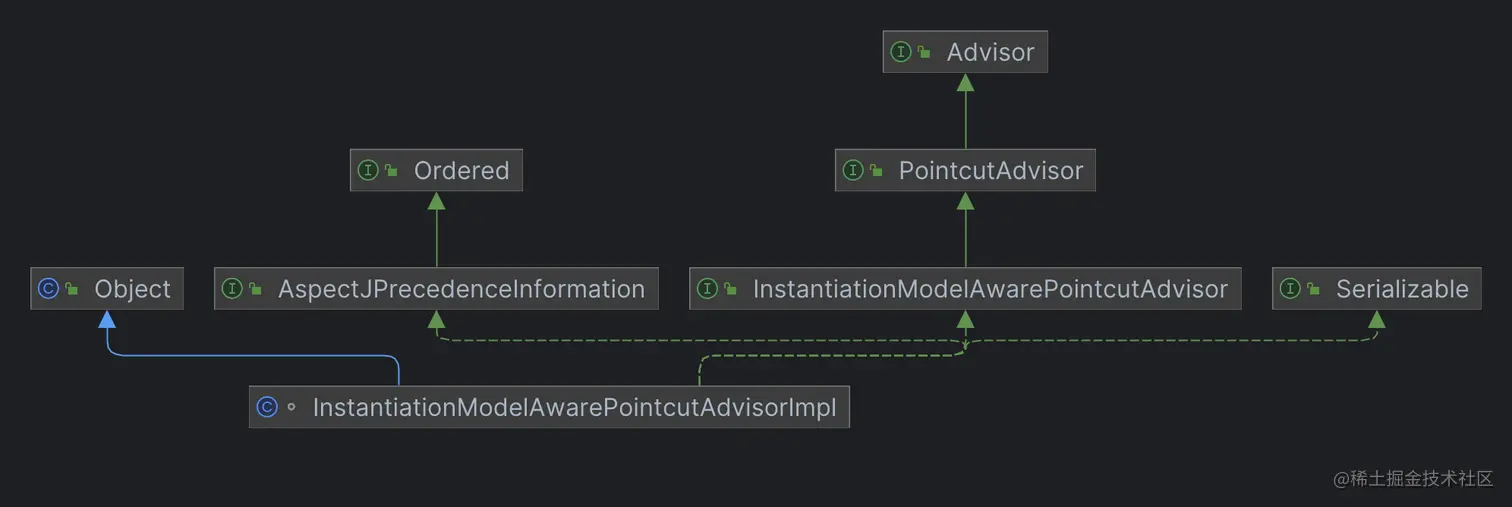 这里创建 Advisor 的方式是通过构造方法创建,它的具体类型是 InstantiationModelAwarePointcutAdvisorImpl,我们现通过继承关系了解一下这个类。